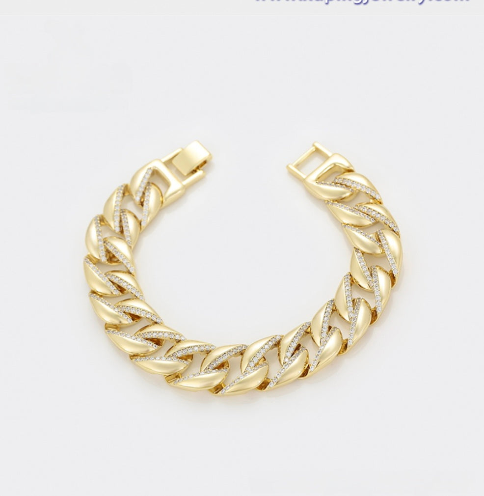 Make a statement with the Pavé Cuban Link Bracelet, a bold yet refined piece designed to elevate any look. Featuring a striking 14mm Cuban link silhouette, this bracelet blends polished gold links with shimmering pavé accents for the perfect balance of modern glamour and timeless luxury. Whether worn alone or layered, it delivers effortless sophistication and standout shine.