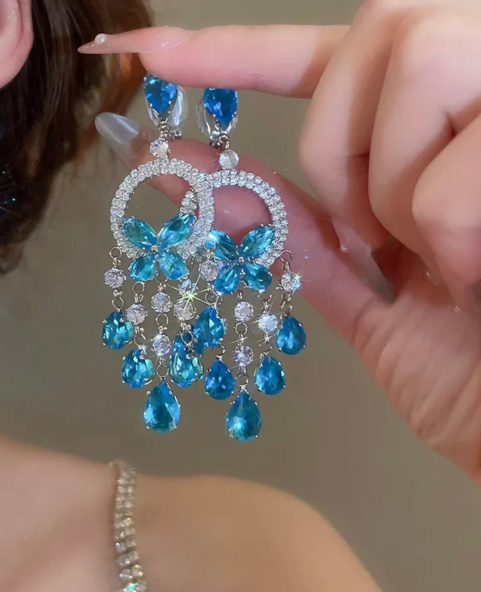 Elegant and radiant, the Aurelia Crystal Chandelier Earrings exude timeless luxury. A shimmering butterfly rests within a halo of brilliance, with cascading crystal drops that sparkle beautifully with every movement — a statement of pure sophistication.