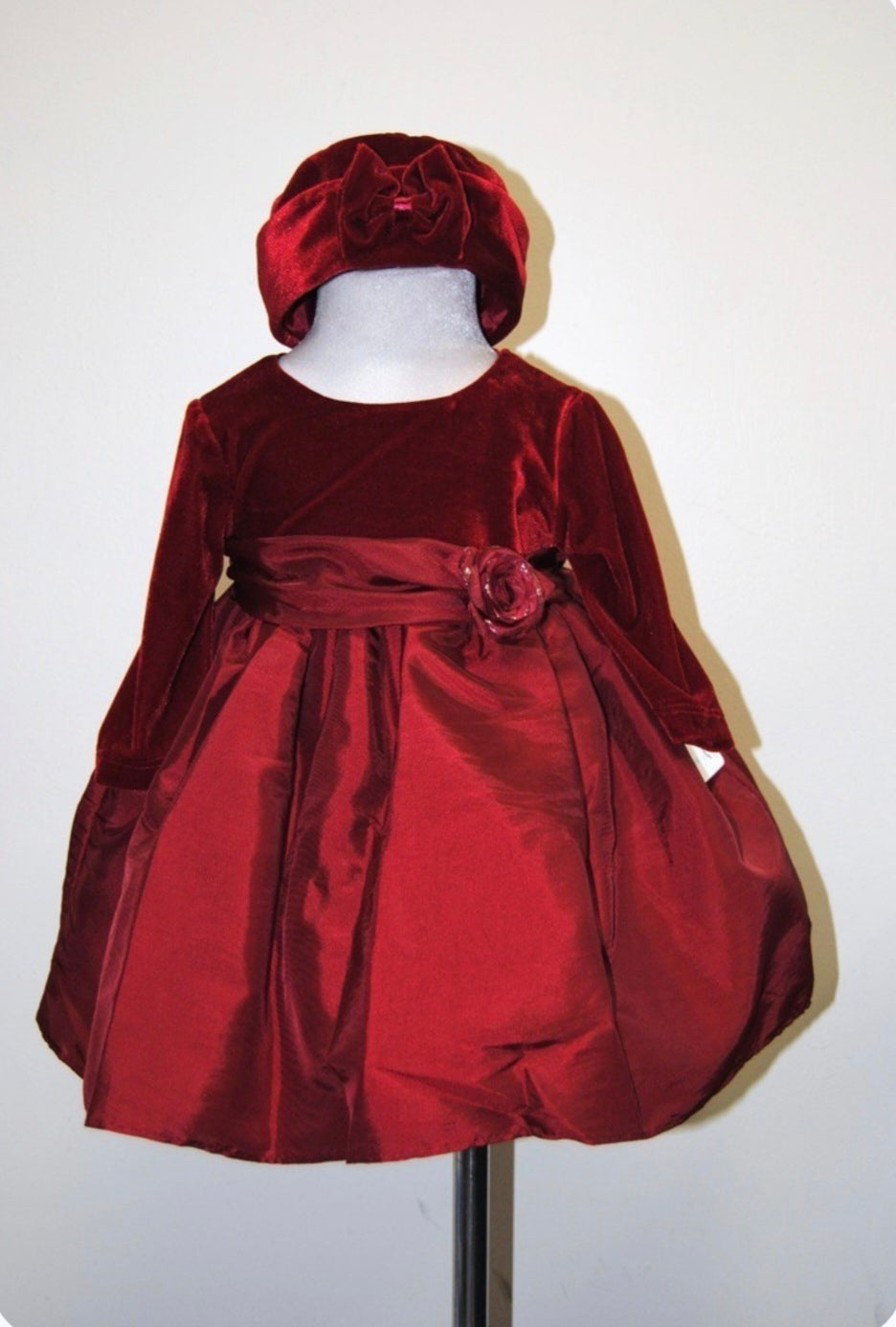 This adorable baby/toddler dress features a mix of fabrics of velvet and taffeta. The velvet bodice and taffeta skirt makes this dress perfect for the holidays or any special occasion!