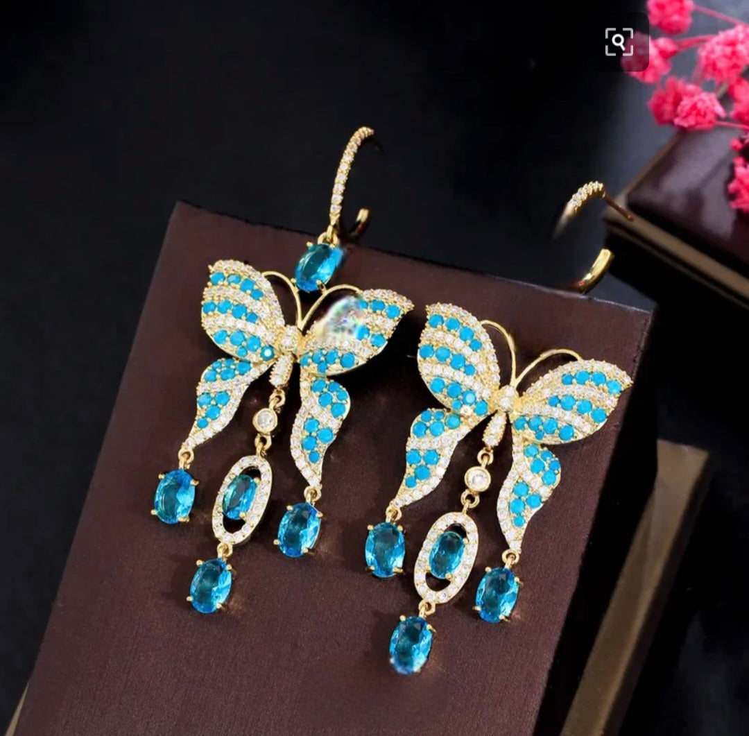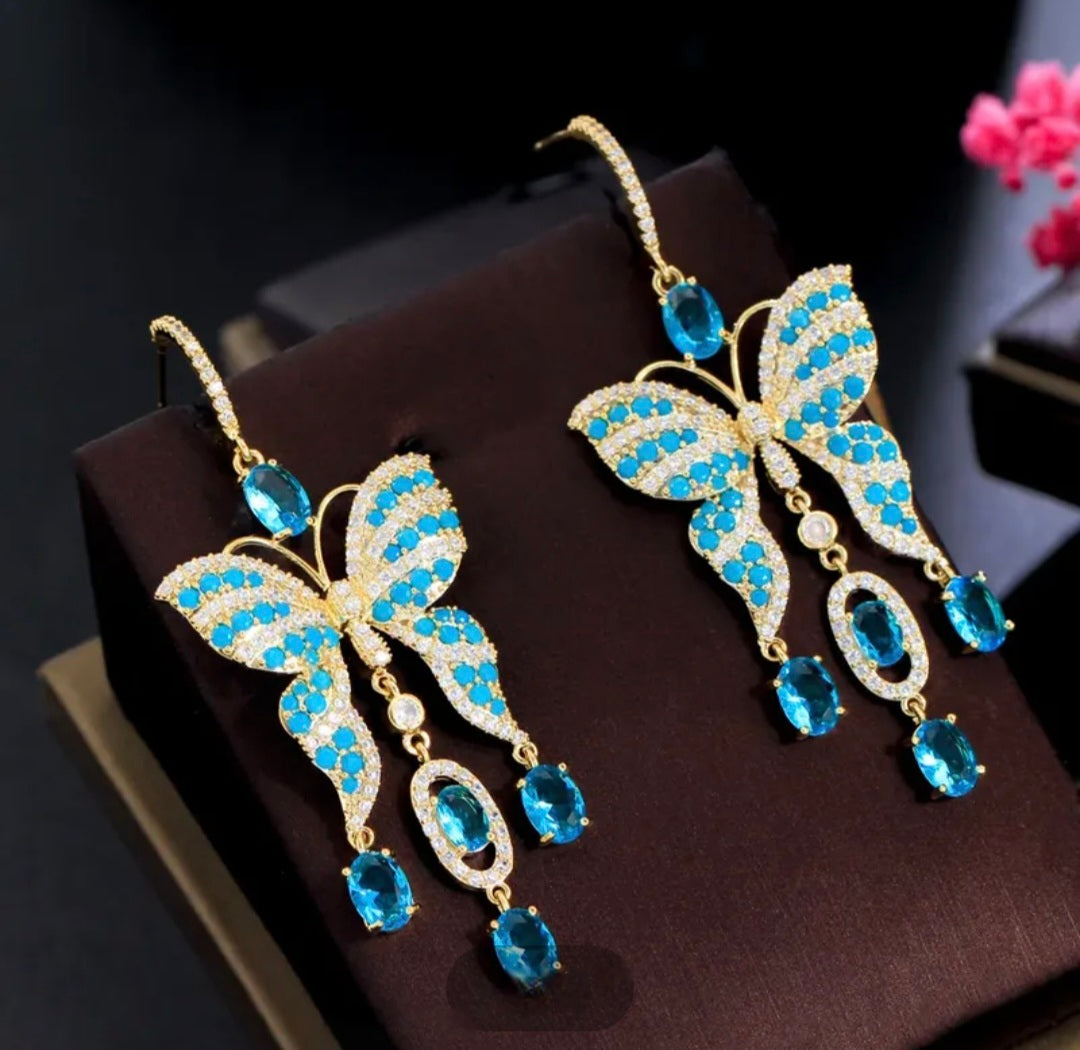 Blue Butterfly Dangle Earrings With Cubic Zirconia Pavé