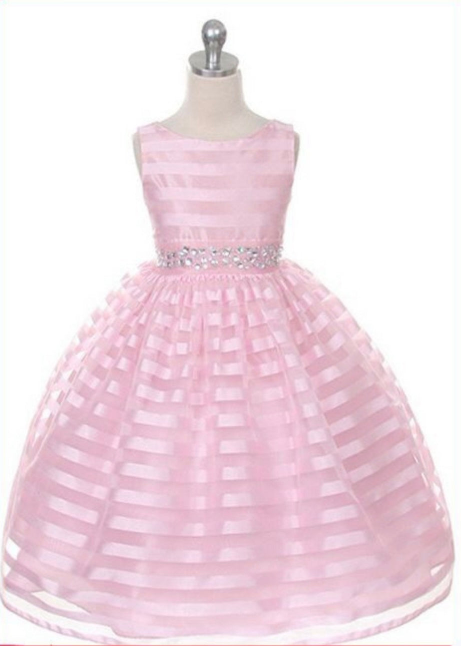 The simple satin detailed stripes give this dress everything it needs to make an impression. The jewelled waistband adds just the right amount of sparkle. Dress has a sash tie back and zipper closure.