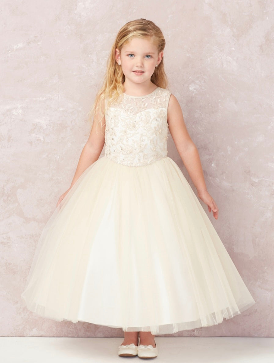 This elegant dress features an illusion neckline with a lace applique bodice. The waist is accented by a rhinestone strip. The back features a deep V and cover-button closure. Perfect for flower girl, communion, or any special event!