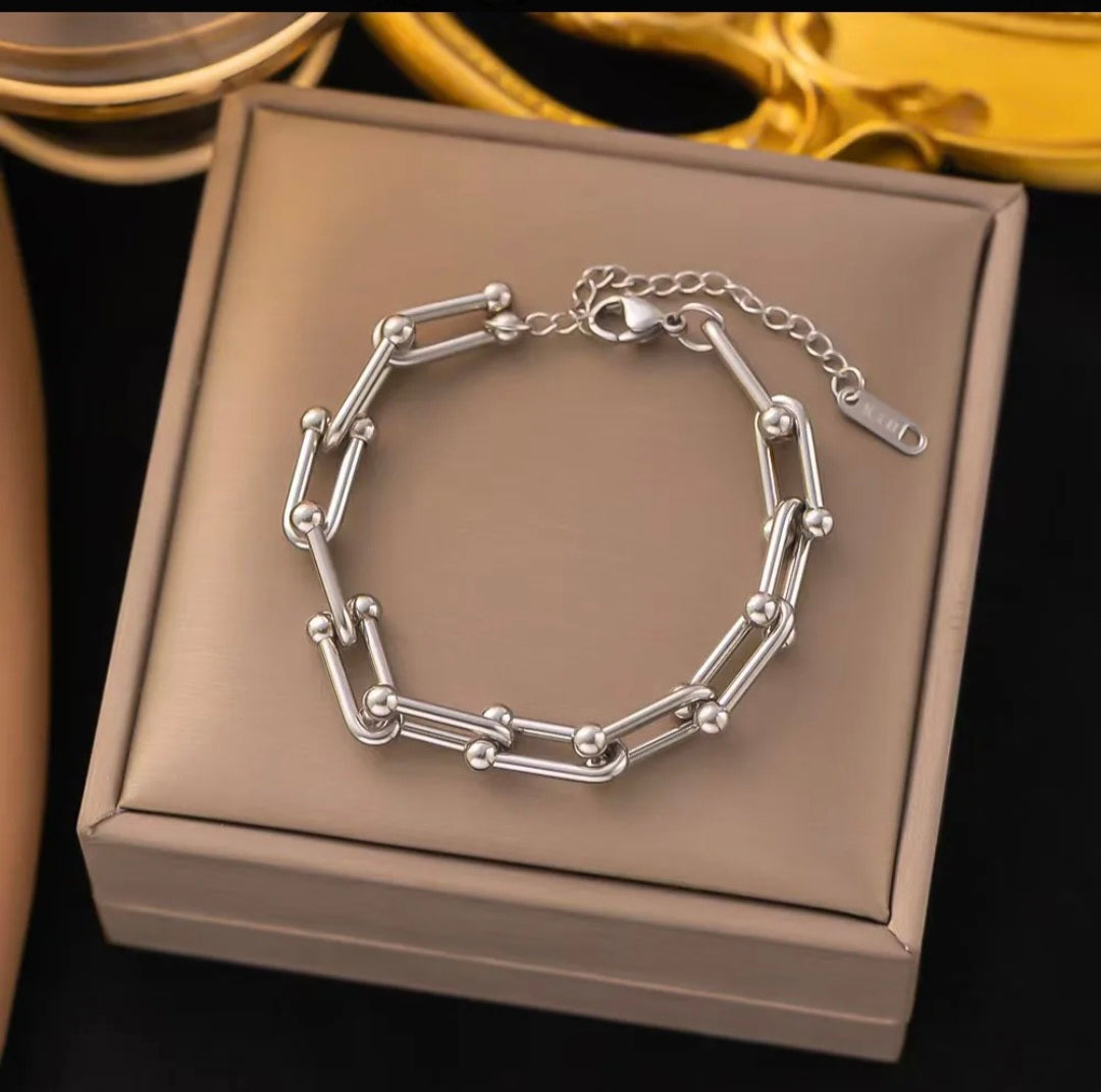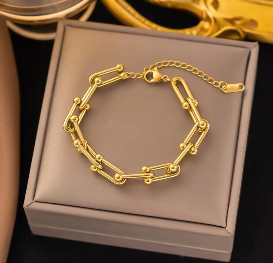 This gold link chain bracelet for women features sleek rectangular links with subtle bead accents for a modern, minimalist look. Designed with an adjustable clasp, this statement bracelet offers a comfortable fit and effortless styling for everyday wear or special occasions.