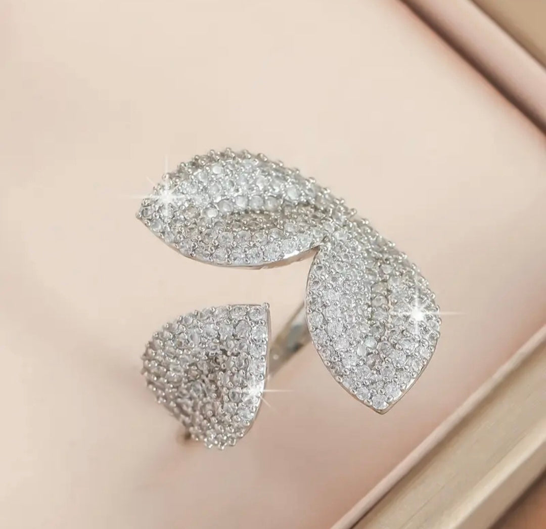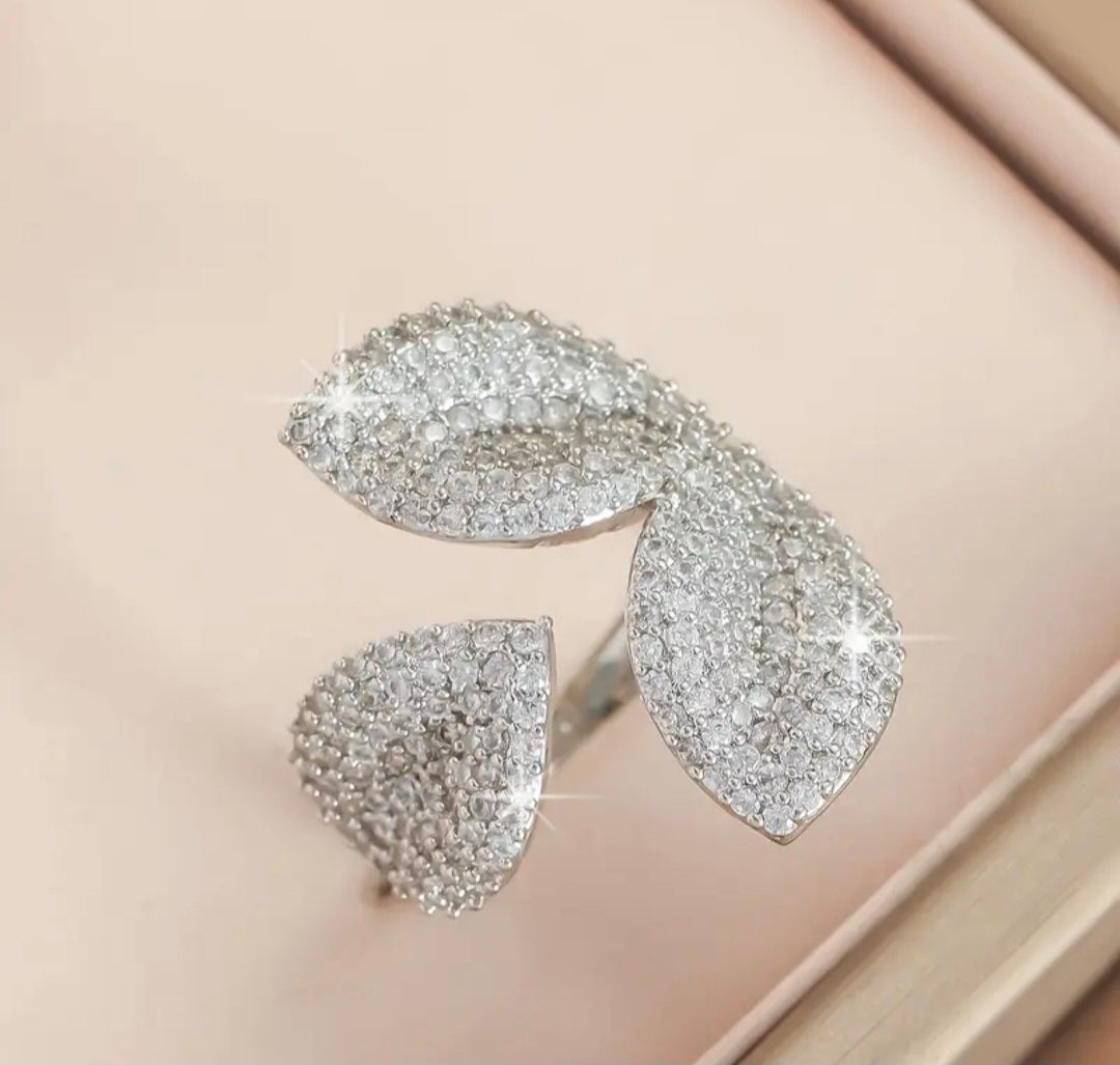 Elevate your look with this shimmering petal-inspired wrap ring, crafted with a sweeping duo-leaf design that catches the light from every angle. Its adjustable open band offers a comfortable, tailored fit while the pavé-set stones add a refined sparkle. Perfect for stacking or wearing as a standout statement piece, this ring brings a touch of modern elegance to any outfit.
