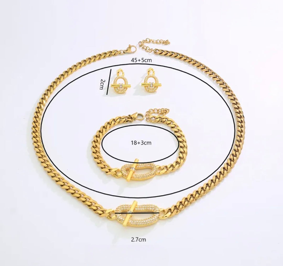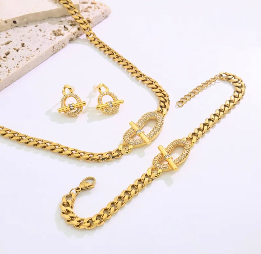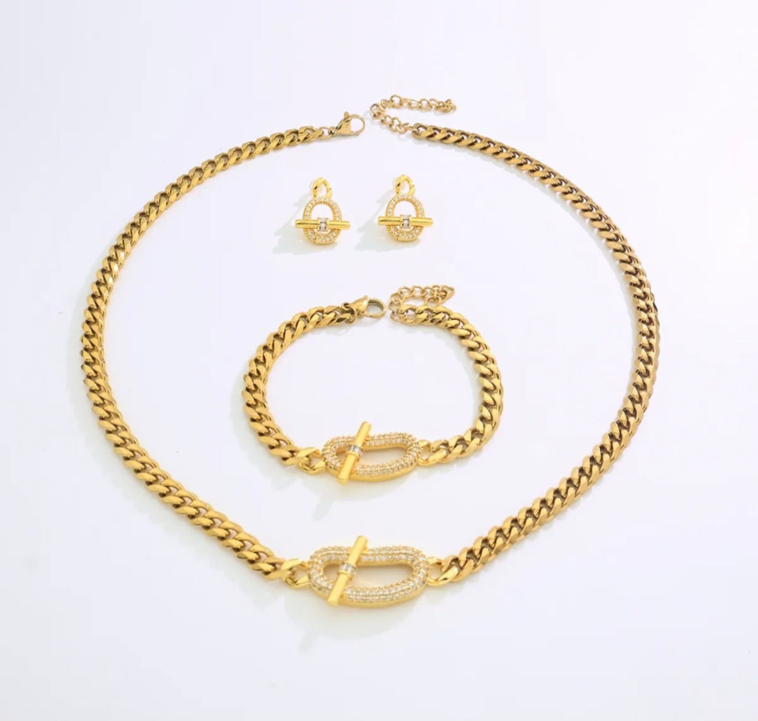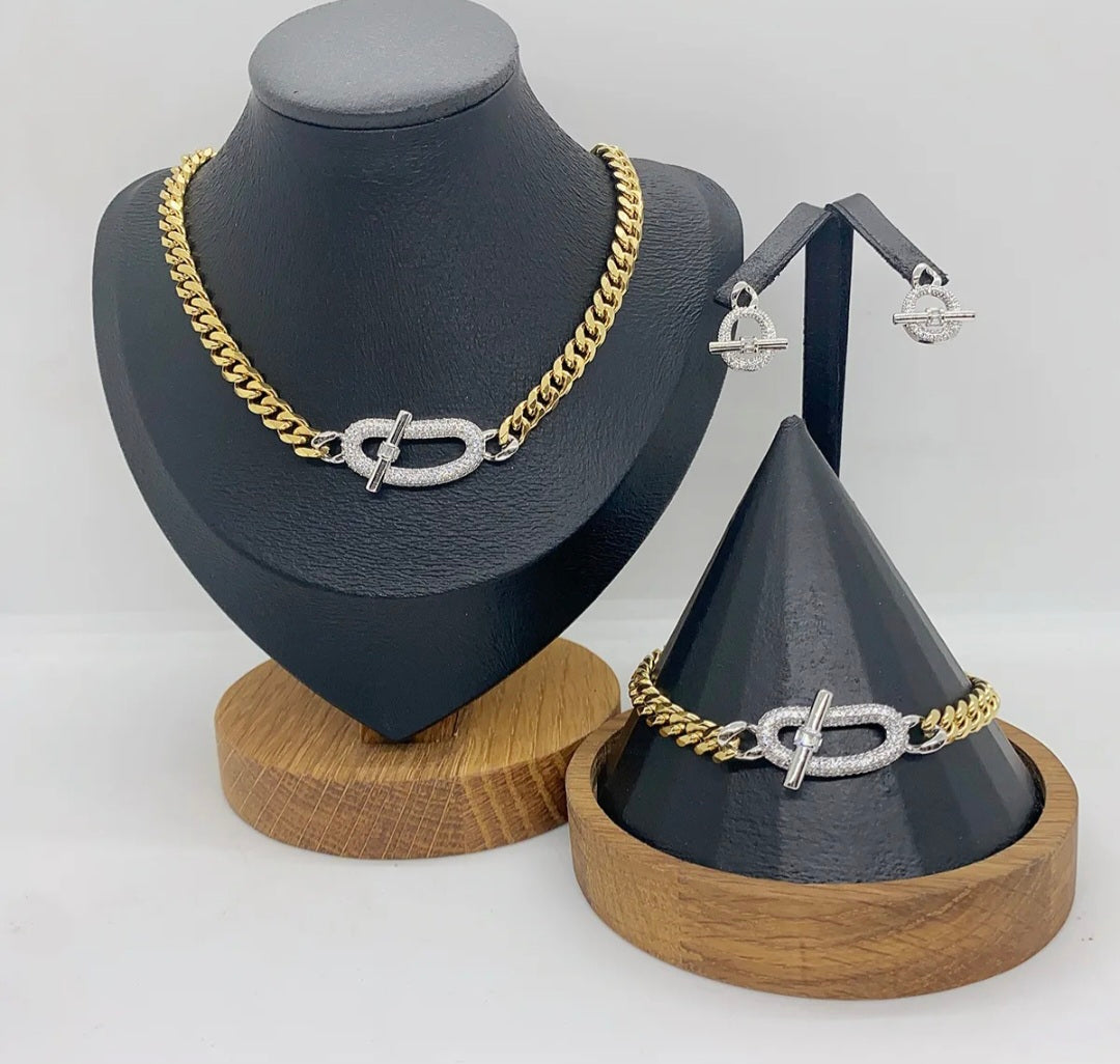 A modern classic featuring a sleek chain and signature toggle detail. This coordinated necklace, bracelet, and earring set adds effortless polish to any look—day or night. Bold, timeless, and easy to wear.