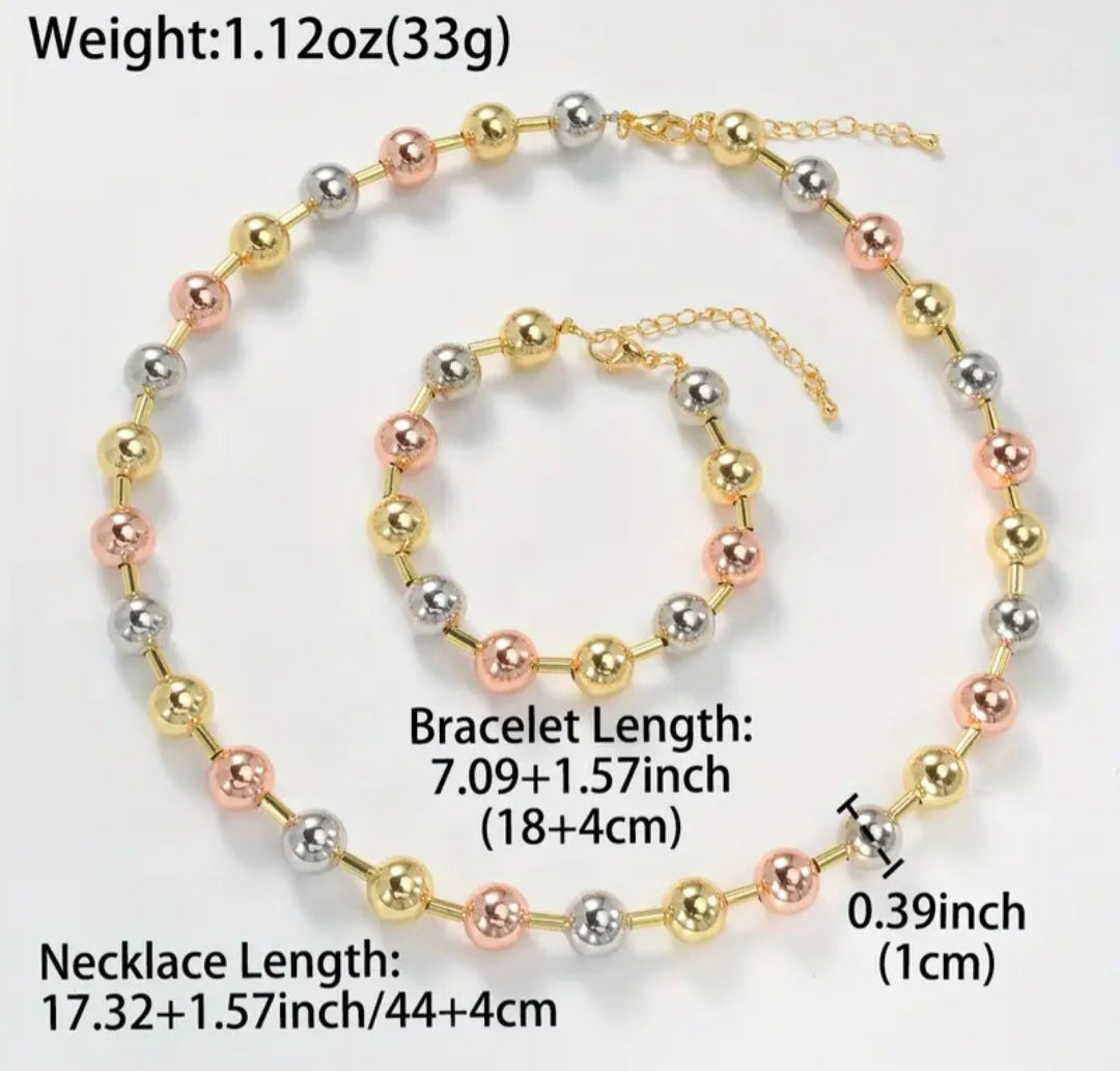 Clean lines. Effortless style. The Trinity Glow Necklace and Bracelet Set features smooth metallic beads in a sleek, modern design. A minimalist blend of rose gold, gold and silver tones brings quiet sophistication to any look—simple, balanced, and endlessly versatile.