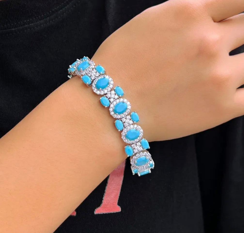 A clean, minimal lineup of turquoise-toned oval stones accented with gentle sparkle. The Turquoise Oval Bracelet delivers simple elegance with its adjustable 19 cm + 1.3 cm fit—fresh, refined, and effortlessly stylish.